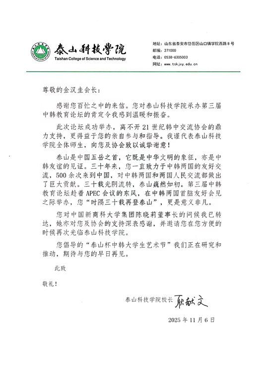 11月6日,泰山科技学院校长耿献文回函表示:“从论坛的成功举办离不开21世纪韩中交流协会的鼎力支持与金会长的亲自指导。”他回顾了泰山作为中韩友谊象征的文化意义,并强调金会长三十年来500余次往返中韩,为两国交流作出重要贡献。耿献文同时表示,“陈晓莉董事长诚挚邀请金会长在方便时再次访问学校。”
