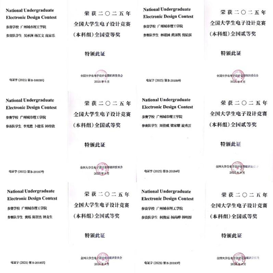 广州城市理工学院学子在2025年全国大学生电子设计竞赛中获得全国一等奖1项,全国二等奖5项,省级一等奖11项,省级二等奖6项,省级三等奖7项。国赛成绩位列为广东省本科组第一,省赛成绩位列广东省并列第一,创学校参赛历史最好成绩。