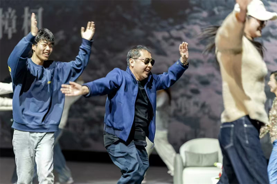 音乐响起,晋中信息学院学子为贾导送上一份特别惊喜,以群舞演绎《Go West》,在大家热烈情绪的感染下,贾樟柯导演起身,加入到大家舞蹈的队伍之中,全场齐声三次呼喊的“贾科长,欢迎回家”瞬间将现场氛围推向高潮。