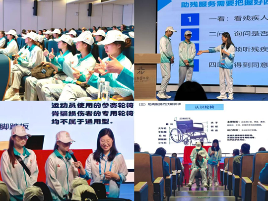 为更好地服务残特奥会,19名“小海豚”志愿者骨干参加助残服务专项培训。他们学习了无障碍沟通技巧、轮椅推行规范、视障引导方法等专业知识,更在实践中培养了细致入微的观察力和同理心。培训结束后,志愿者骨干将所学内容传达给每一名“小海豚”志愿者,全力保障赛事顺畅高效开展。