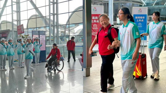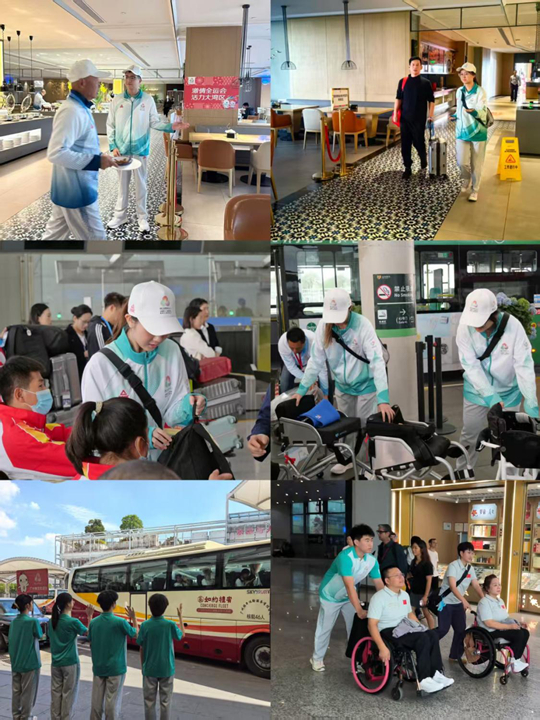 “小海豚”志愿者遵循“平等、尊重、适度、暖心、精准、高效”原则,以伙伴、朋友的身份提供服务,注重残障人士的自主性与独立性,营造暖心服务氛围。在白云机场T1、T2、T3航站楼接机口,“小海豚”志愿者会提前核对残障运动员的航班信息,推着可折叠的无障碍行李车等候,为坐轮椅的运动员搬运行李并平稳护送其通过特殊通道;遇到视力障碍的运动员,志愿者会轻握对方的手腕引导其避开人群,还会提前告知前方路况。从最初志愿者问运动员“您好,需要帮忙吗?”到运动员遇到问题主动问“志愿者,我的同伴需要去T1,能带他去T1吗?”这不仅仅是对志愿者服务的认可,更是一份信任。