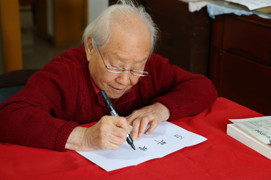 冬日的阳光透过窗棂,静静洒在铺着红布的桌面上。贠奶奶银白的发丝在光中微微发亮,她双手轻颤却坚定,一笔一画写下了“百年培华,欣欣向荣”八个字。那一刻,时光仿佛被阳光拉得很长,很长。