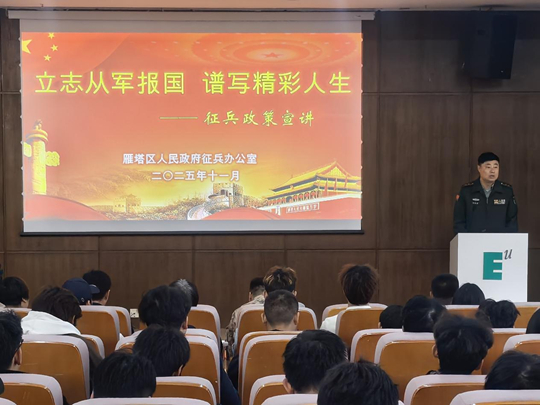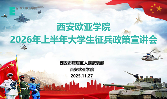 国无防不立,民无兵不安。为深入贯彻落实习近平总书记强军思想,积极响应党中央、中央军委关于征集高素质青年入伍的战略部署,引导广大青年学子将爱国之心化为报国之行,11月27日,以“志存高远砺青春,建功立业赴军营”为主题的西安欧亚学院2026年上半年大学生征兵政策宣讲会在学校图书馆学术报告厅隆重举行。此次活动不仅是一场精准的政策解读会,更是一堂深刻的思想动员课和国防教育课,正式掀开了西安欧亚学院新一年度征兵工作的序幕。