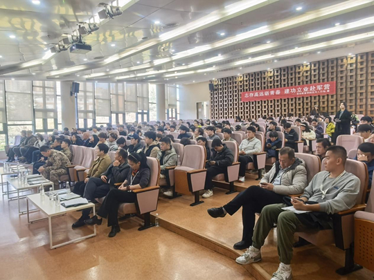 宣讲会由西安欧亚学院2025年优秀退役复学女兵罗昕雨同学主持。宣讲会现场济济一堂,气氛庄重而热烈。出席活动有西安市雁塔区人民武装部副部长刘洪栋、军事科参谋杨斌;西安欧亚学院稳定办常常务副主任、后勤集团副总经理强建旗、学工部副部长陈劲松、第三分党委书记陈振星、学生事务督导田志刚、学生资助管理中心资助专员郭晓慧、职业发展与企业合作部(DCC)就业专员张鑫桃、西安欧亚学院征兵工作站站长高奇、副站长李涛、西安欧亚学院保卫处张亚军老师等职能部门相关领导、各青年社区毕业生辅导员与满怀报国热忱的毕业生代表近260人齐聚一堂,共同聆听来自军营的召唤,现场洋溢着浓厚的家国情怀与昂扬的青春斗志。
