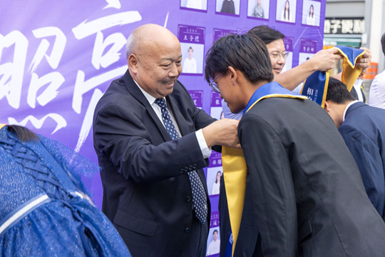 活动伊始,校领导们逐一为新生佩戴上象征成长与初心的荣誉绶带。绶带垂肩,不仅是学院院徽中卓越精神的体现,更是对学子们未来“追求卓越”的无声期许。
