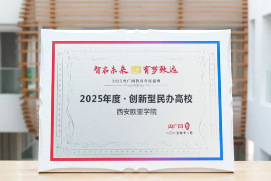 另外,在2025年12月26日举办的央广网教育年度盛典上,西安欧亚学院获颁“2025年度创新型民办高校”称号,这是对学校长期以来坚持在地国际化高质量发展、深化产教融合推进校企协同育人的办学成果的高度肯定。