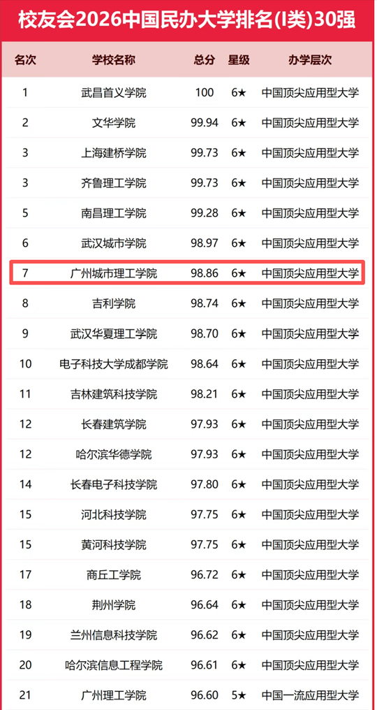 | 校友会2026中国大学排名发布 广州城市理工学院连续5年位居广东省理工类民办大学首位! |