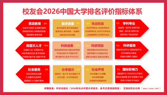 校友会2026中国大学排名评价指标体系由办学层次、思政教育、教学质量、高层次人才、杰出校友、学科专业、科研基地、科研项目、科研成果、社会服务、社会声誉和国际影响力等12大一级指标组成,基于“大平台、大团队、大项目、大成果、大校友”体系框架展开系统评价,涵盖的评价指标达900多项。