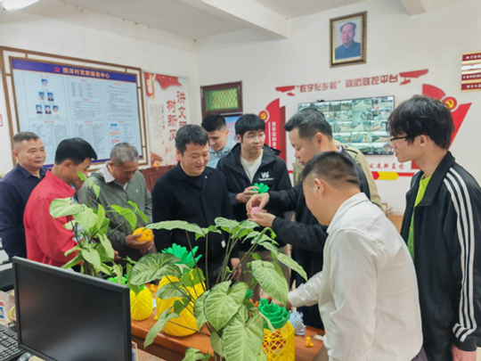 在田洋村委会,黄旭一行认真听取了科技特派员团队的工作汇报。团队依托专业优势,围绕当地菠萝产业,精心设计了18款具有特色的菠萝IP形象。这些形象结合菠萝自然形态与本土文化,通过现代设计手法焕发新生,体现了科技与文化的有机结合。团队还运用3D打印技术,将设计转化为实物文创产品,全部移交田洋村使用,既丰富了村庄文化风貌,也为菠萝产业品牌化与市场化开辟了新途径。