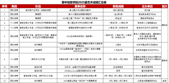 本年度,晋中信息学院师生在国内多项艺术赛事中持续突破,累计荣获20余项大奖,在舞蹈、设计、戏剧等多领域实现品牌升级与口碑沉淀。