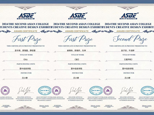 2025年2月,在第二届亚洲大学生创意设计展中,信院学子荣获一等奖2项、二等奖1项;2025年5月,在中国好创意暨全国数字艺术设计大赛中荣获1项一等奖、1项三等奖。