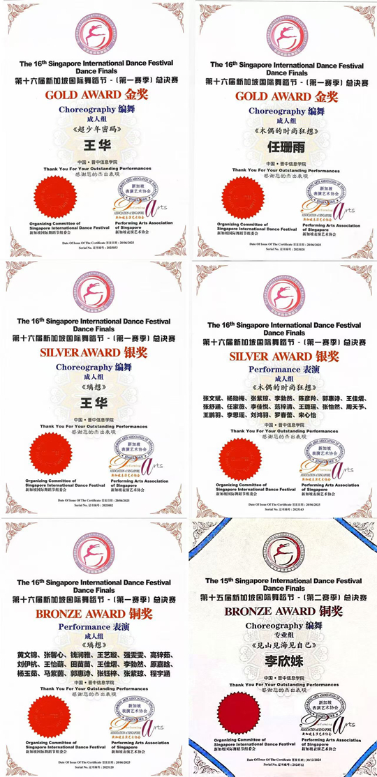 2025年5月,第三届“芳华杯”成人舞蹈艺术展演中,一举夺得9项金奖,印证了舞蹈教学与实践的高水准;2025年6月,于亚洲青年新秀奖(春季赛)中斩获3项一等奖、7项二等奖、7项三等奖、11项优秀奖;2025年9月,在第十六届新加坡国际舞蹈节中,荣获2金、2银、2铜的佳绩。
