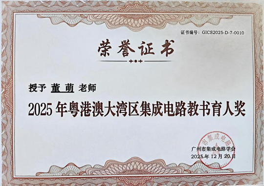 集成电路专业作为电子信息工程学院/通信工程学院重点建设的特色专业,学院始终以人才培养为核心,紧扣粤港澳大湾区集成电路产业发展需求,以“产教融合、科教协同”为核心推进教学改革。此前,学院已组织教师团队参加2025年粤港澳大湾区集成电路学术年会,与业界专家、高校同行共探学科前沿动态、教学模式创新与人才培养路径。此次董萌获奖,正是学院在师资建设、专业发展、教学质量提升等方面扎实工作的有力印证。