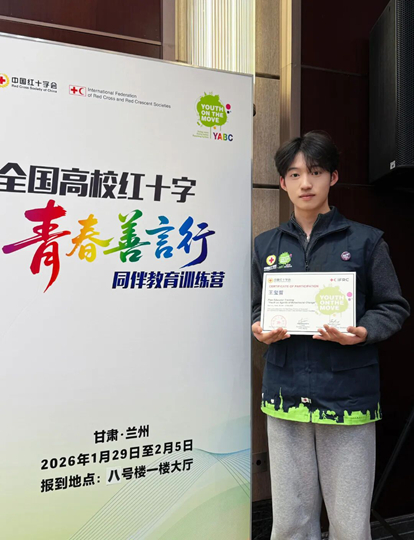 近日,2026年全国高校红十字“青春善言行”(YABC)同伴教育训练营在甘肃兰州隆重开班,来自全国14个省份的80余名红十字青年骨干齐聚一堂,接受系统性同伴教育能力培养。西安铁道技师学院学生会主席、校团委学生助理王玺哲凭借其在公益志愿服务领域的突出表现与扎实专业素养,受邀作为陕西省高校代表之一参与本次培训。
