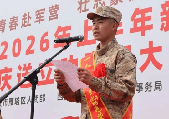 在本次雁塔区新兵入伍欢送暨庆送立功喜报大会上,传媒与设计学院学生佟德鑫代表全区入伍新兵发言。他表示,作为新时代青年,要生逢盛世,更应勇担使命。今后,将牢记保家卫国的初心使命,把个人理想融入国防事业,以坚定的理想信念筑牢思想根基;将严守军队铁的纪律,绝对服从命令、听从指挥,锤炼过硬作风;将发扬不怕苦、不怕累的精神,刻苦训练、潜心钻研,努力提升军事本领,敢闯敢拼、勇当标兵;将始终心系母校、情系故里,牢记母校的教诲,不负家乡的期望,用热血与汗水书写青春无悔的军旅答卷,争取早日建功军营、载誉归来,为母校争光、为家乡添彩。