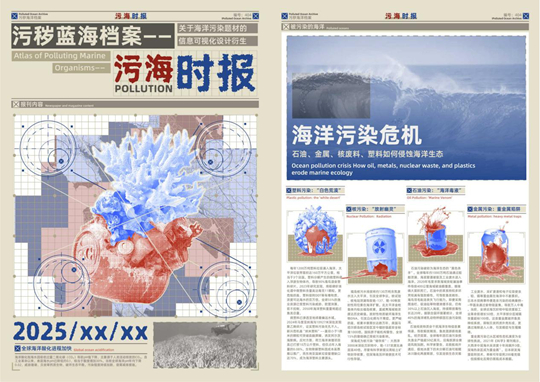 珠宝学院学生王奇瑞的作品《污海图鉴》旨在通过深入分析招贴艺术的发展历程以及海洋环境保护的相关资料,以招贴设计为核心创作形式,实现以海洋环境保护为主题的创意设计,着重探讨如何将海洋污染信息与海洋生物形象相结合,以视觉形态化的语言呈现海洋污染现状,传递生态保护理念。
