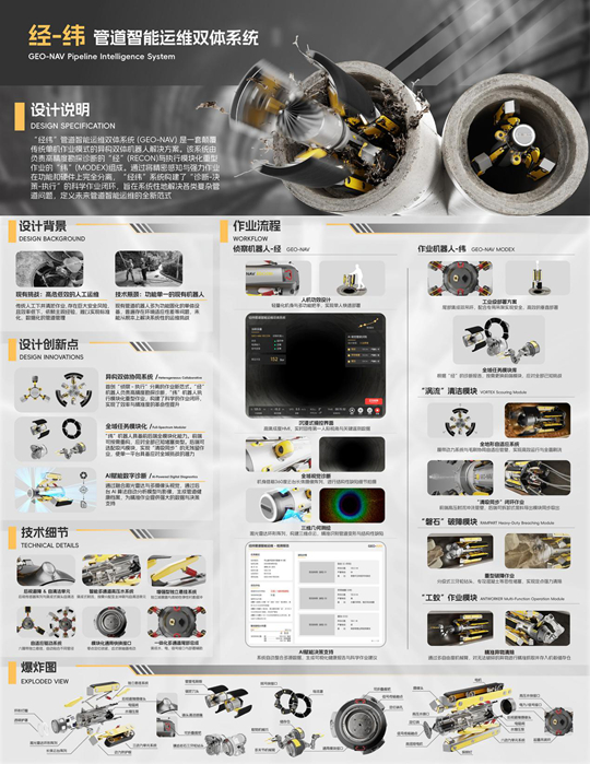 机械工程学院/机器人工程学院学生林荣鑫作品《“经纬”管道智能运维双体系统》是一套颠覆传统单机作业模式的异构双体机器人解决方案。该系统由两款功能高度耦合的机器人组成:勘探机器人“经”(RECON) 负责进入管道进行三维测绘与无损诊断,生成高精度健康报告;作业机器人“纬”(MODEX) 则根据诊断数据,通过快速更换模块化的重型作业前端,对目标问题进行精准的物理清除。通过将精密感知与强力作业在功能和硬件上完全分离,“经纬”系统构建了“诊断——决策——执行”的科学作业闭环,从而能够系统性地解决传统方案难以应对的复杂管道问题。
