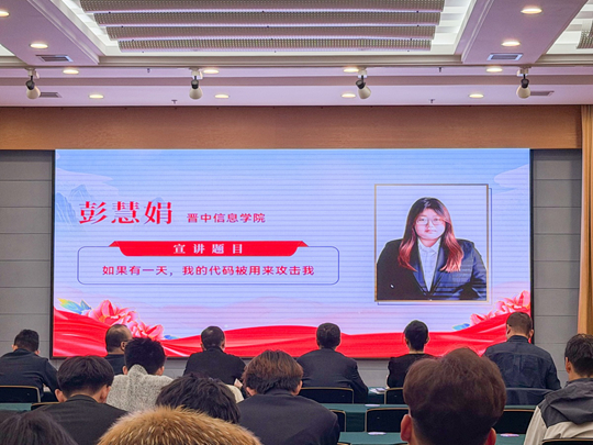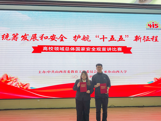 4月8日-9日,由中共山西省委教育工作委员会主办的山西省高校领域总体国家安全观宣讲比赛在山西大学举行。晋中信息学院信息工程学院彭慧娟同学凭借题为《如果有一天,我的代码被用来攻击我》的精彩宣讲,从全省高校选手中脱颖而出,荣获三等奖,信息工程学院辅导员范志刚荣获“优秀指导教师”称号。