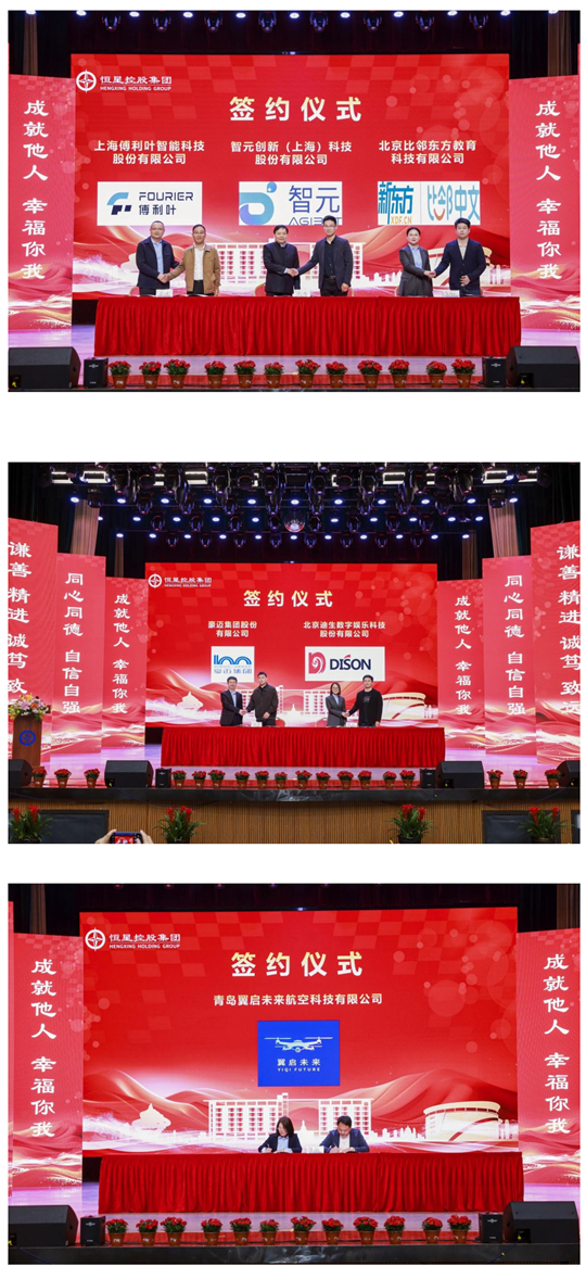 签约仪式上,恒星控股集团与智元创新(上海)科技股份有限公司、上海傅利叶智能科技股份有限公司、北京比邻东方教育科技有限公司、豪迈集团股份有限公司、北京迪生数字娱乐科技股份有限公司、青岛翼启未来航空科技有限公司签署合作协议,双方围绕人工智能、人形机器人、低空经济、数字传媒、高端制造等领域,共建产教融合实训基地、共研技术项目、共育专业人才,打通产学研用闭环,助力新质生产力发展。
