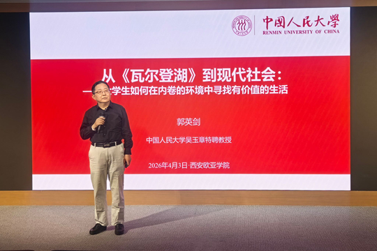 3个小时里,中国人民大学全民阅读教育研究院院长郭英剑教授为师生们带来《从〈瓦尔登湖〉到现代社会:大学生如何在内卷环境中寻找有价值的生活》的主题讲座,郭英剑、郑州大学外国语与国际关系学院院长高晓玲教授、西安欧亚学院回声学者童明教授三位嘉宾围绕经典阅读与人文教育的核心议题各抒己见、交锋碰撞,整场论坛话题从瓦尔登湖畔的小木屋延伸至当下的内卷与AI时代,从学者的个人阅读史探讨到经典的价值判断,几经转换却始终主线明晰:阅读从来不止是获取信息的工具,更是人们理解世界、认知自我、守护独立思考能力的根本方式。