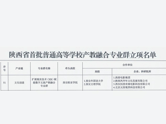 由西安欧亚学院牵头,联合西影集团、华商数字文旅研究院、西安外国语大学、西安文理学院等企业和高校申报的“扩展现实技术(XR)赋能数字文旅产教融合专业群”,正式获批陕西省首批产教融合特色专业群立项建设项目。