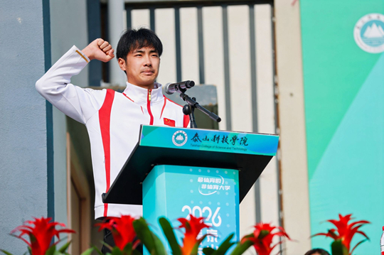 谢承红在致辞中表示,健康是立身之本,体育是强国之基。学校始终将体育工作作为立德树人的重要环节,推动体育教育与人才培养深度融合,让体育成为滋养每位学子生命成长的必修课。他介绍到,过去一年,泰山科技学院体育工作取得丰硕成果:学校游泳队在第24届中国大学生游泳锦标赛(北方赛区)中夺得9金7银2铜,6次打破赛会纪录,荣获乙组团体总冠军,创造了非体育类高校在全国性游泳赛事中的历史最好成绩;和球队代表山东省出征全国比赛获第四名;铁人三项队首次参加中国超级铁人三项赛即获团体季军;足球队获山东省大学生足球联赛亚军;男篮首捧山东省大学生三人制篮球联赛冠军;女篮在CUBAL联赛中获山东省亚军;武术队获全国大学生长短兵团体冠军;田径队获全省团体冠军。谢承红表示,“体育育人、淬炼精神、锻造人格”的主张已通过公共游泳必修课、营地教育、淬炼领导力课程、素质拓展、泰山野战训练营、校队开放日、开学第一跑、40公里计划、全年12200余场体育赛事等载体,融入师生日常。