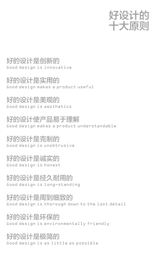 结合拉姆斯个人成长与时代经历,他梳理其在博朗阶段的代表性设计创作,完整介绍拉姆斯 “关于好设计的十个原则”,同时重申:“优秀的设计需要创新、实用、诚信和环保,极简的。”