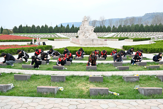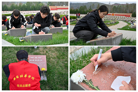 | 西安培华学院学子清明祭扫烈士陵园 为墓碑描白去尘 |