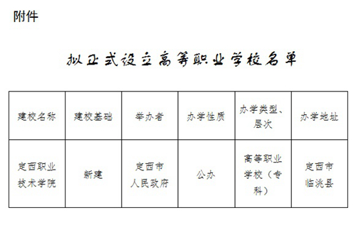 根据《中华人民共和国高等教育法》《普通高等学校设置暂行条例》《高等职业学校设置标准(暂行)》等有关规定,拟正式设立定西职业技术学院,现予以公示。公示期为2023年3月22日至3月28日。