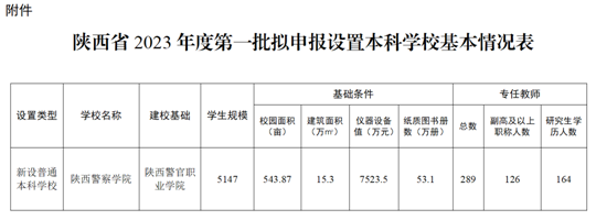 依据《中华人民共和国高等教育法》《普通本科学校设置暂行规定》等有关规定及教育部有关要求,经学校申报、形式审查、省高评委专家组进校考察等程序,陕西省教育厅将设立陕西警察学院列入2023年度第一批拟申报设置本科学校名单,现将该校的基本情况予以公示(见附件)。