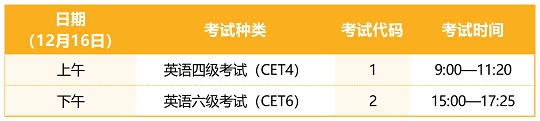 CET考试时间为12月16日,开考科目为英语四级和六级。