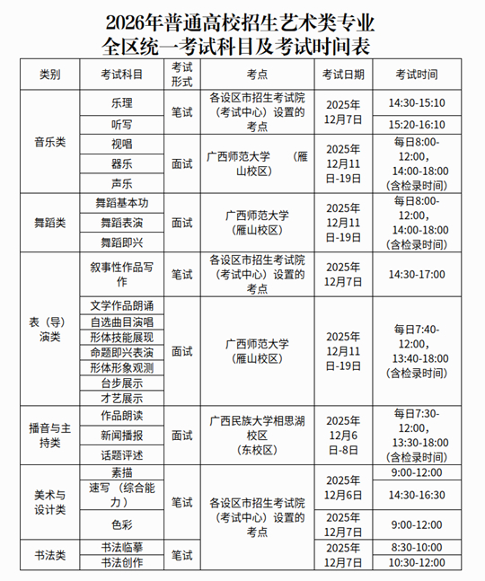 2026年普通高校招生艺术类专业全区统一考试(以下简称全区艺术统考),设置音乐类、舞蹈类、表(导)演类、播音与主持类、美术与设计类、书法类、戏曲类等7个考试类别,其中戏曲类采用省际联考由相应专业(剧种)的组考院校负责组织(另文公布),其余考试类别由我院组织,具体安排如下表: