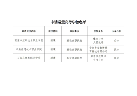 根据《中华人民共和国高等教育法》《高等职业学校设置标准(暂行)》等有关规定,经河北省高等学校设置评议委员会专家考察和评议,新设张家口应用技术职业学院、辛集应用技术职业学院、石家庄康养职业学院事项获得通过,现将学校名单向社会公示。
