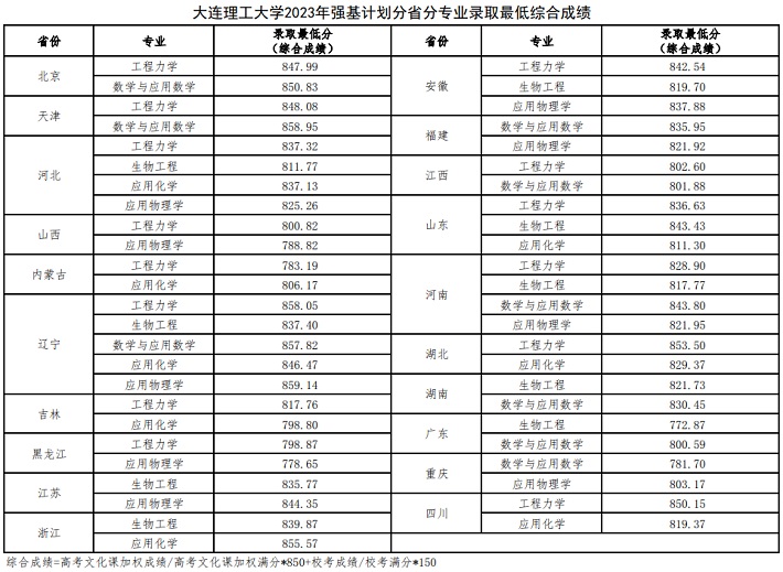 大连理工大学2023年强基计划分省分专业录取最低综合成绩