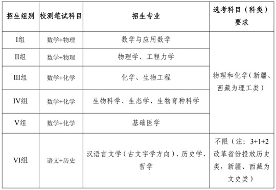 高考后出分前,已完成考试确认的第一类考生参加我校组织的初试,初试形式为笔试,具体安排详见后续我校本科生招生网最新公告。笔试科目:Ⅰ组和Ⅱ组为数学和物理,Ⅲ组、Ⅳ组和Ⅴ组为数学和化学,Ⅵ组为语文和历史。