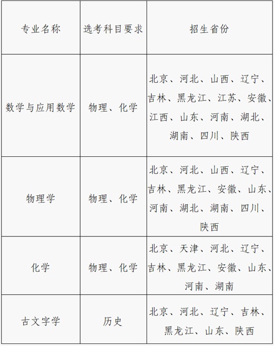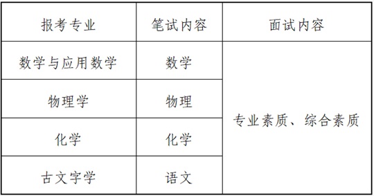 报考数学与应用数学专业、物理学专业、化学专业考生高考成绩(不含任何政策加分,下同)高于生源所在省公布的特殊类型招生录取最低控制分数线80分(含);报考古文字学专业考生高考成绩(不含任何政策加分,下同)高于生源所在省公布的特殊类型招生录取最低控制分数线60分(含)的基础上,依据高考成绩,原则上按照不超过我校分省分专业招生计划数的六倍确定各省入围我校考核考生名单(末位同分均可入围),并公示入围标准。对于报考我校数学与应用数学专业的考生,高考数学成绩达到145分及以上,高考成绩达到生源所在省公布的特殊类型招生录取最低控制分数线但未达到入围标准的,可予以破格入围,破格入围人数不超过分省分专业招生计划数的六倍。