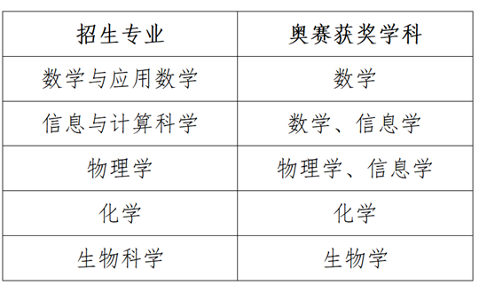 我校将对在数学、物理、化学、生物学、信息学奥林匹克竞赛中获得全国决赛二等奖及以上奖项的报名考生审核其相关学科领域的竞赛成绩,审核通过后可以破格入围。审核通过的破格入围考生高考成绩须达到所在省(自治区、直辖市)同科类部分特殊类型相应最低录取控制分数线。