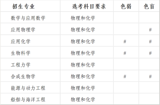 我校招生专业包括数学与应用数学、应用物理学、应用化学、生物科学、工程力学、合成生物学、能源与动力工程、船舶与海洋工程。所有招生专业在非高考改革省份招收理科考生,在高考改革省份选考科目要求见下表: