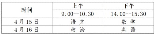 考试科目为语文、数学、政治、英语四科,每科满分为150分,四科满分为600分,使用国家通用语言文字作答。