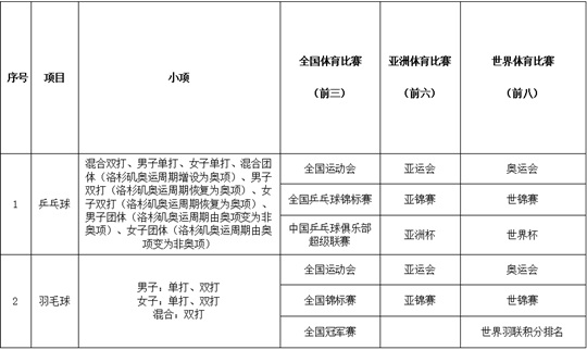 注:表中“全国、亚洲、世界体育比赛”未注明组别的项目,均为最高组别。 |