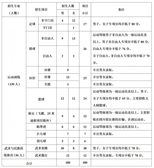 运动训练招生计划130人,武术与民族传统体育招生计划50人,分项目招生计划如下表: