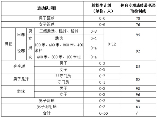 3.在达到我校文化成绩和体育专项成绩最低录取控制线的基础上,我校根据考生的文化成绩和体育专项成绩,按3:7的比例折算综合分,综合分=(文化成绩/6)×30% + 体育专项成绩×70%,综合分计算时按四舍五入法保留两位小数。分项目(部分项目分男女)按考生综合分从高到低择优录取。
