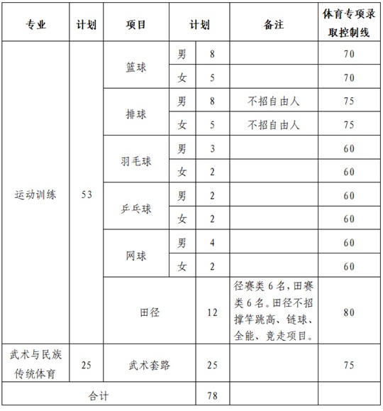 (一)根据国家体育总局文件精神,文化考试成绩录取控制分数线不低于180分,体育专项成绩录取控制分数线详见招生专业和计划表。在达到学校文化和体育专项成绩最低录取控制线的基础上,根据考生的文化成绩(折合百分制后)和体育专项成绩3:7的比例进行综合评价,计算考生录取综合分。具体公式:综合分=(文化成绩/6)×30%+体育专项成绩×70%。综合分计算时保留小数点后两位,采用四舍五入计数保留法。对具备一级运动员技术等级称号的考生,我校可在文化成绩最低录取控制线下降低30分录取;对具备运动健将技术等级称号的考生,可在文化成绩最低录取控制线下降低50分录取。