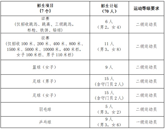 2.我校体育专项成绩录取控制线:径赛80分,田赛75分,篮球(女子)70分,足球(男子)80分,足球(女子)非守门员70分,足球(女子)守门员65分,乒乓球68分,羽毛球60分。