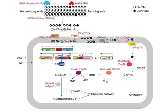 几丁质是自然界中除纤维素以外的第二大生物质资源,其在环境中以结晶形式存在。近年来,单加氧酶(lytic polysaccharide monooxygenase,LPMO)驱动的氧化降解被发现在天然结晶几丁质的降解过程中发挥重要作用。目前已报道的具有几丁质降解活性的LPMO均只能氧化几丁质的C1位原子生成末端为N-乙酰-D-葡萄糖酸内酯(2-(acetylamino)-2-deoxy-D-gluconic acid,GlcNAc1A)的氧化性几丁寡糖。但是,关于细菌(包括陆源和海洋细菌)如何利用几丁质的氧化降解产物至今仍未有研究。