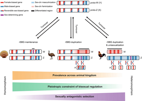 性别起源进化被誉为进化生物学谜题之皇后,是生命科学领域最具吸引力和最热门研究方向之一,而性染色体如何产生与进化更是其中的核心科学问题。一百多年来,围绕具异形性染色体的经典模式生物所展开的相关研究,形成了性染色体进化的传统理论模型,即认为性染色体起源于常染色体,性别决定基因的出现会引起性染色体间发生重组抑制,直至退化成异形性染色体(两条性染色体一长一短)。这一传统理论长期主导了学界对性染色体进化的基本观点。但与之相悖的是,自然界中同形性染色体(两条性染色体无明显分化)比异形性染色体更为普遍存在,却往往被学界解释为仍处于性染色体“进化早期”或只是“规则外的个例”。这不禁让人怀疑,异形性染色体真的是性染色体进化的最终命运吗?为解答这一关键问题,研究团队将视角转向古老起源的海洋冠轮动物类群(动物三大类群之一),通过绘制并收集了横跨整个扇贝科的8个代表性物种染色体水平基因组,利用多组学手段首次鉴定到冠轮动物同形性染色体(ZW)、控制性别决定的主效基因和保守增强子。研究团队惊讶地发现扇贝性染色体呈高度未分化状态且已维持至少3.5亿年之久,是动物界中已知最古老的同形性染色体,甚至比鸟类、哺乳动物等经典异形性染色体分化形成时间的两倍还要久。这一惊人发现有力反驳了同形性染色体仍处“进化早期”的传统论断。通过深入分析发现,与异形性染色体相比,同形性染色体上显著富集大量双向性别偏好基因(即存在雌雄表达偏好的可逆性反转),这些基因多能性的进化限制可能是维持性染色体不分化的普适性机制。此外,发现由性别决定增强子易位所驱动的性染色体转换也是维持同形性染色体的重要因素。通过跨动物类群比较分析,发现当性染色体从同形向异形转变时,需要性二态和性选择压力的驱动,并通过基因加倍将双向性别偏好基因亚功能拆分,以解除其基因多能性的进化限制。这一发现揭示了同形性染色体的稳态维持才是性染色体进化的“常规”,驳斥了传统理论模型的“同形→异形”进化宿命论,从而更好地解释了为何自然界中同形性染色体比异形性染色体更为普遍存在的现象。本研究提出了性染色体维持和分化的新进化模型,修正了传统理论模型的缺陷,为理解性别起源进化和遗传调控开辟了崭新的研究视角。