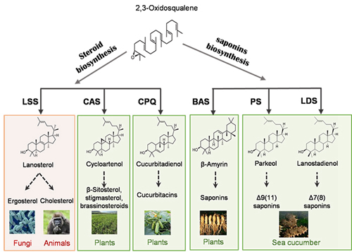 图2. 海参皂苷合成途径与经典动植物固醇合成途径比较