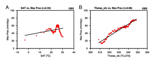 众所周知,SAT衡量的全球变暖空间分布呈现三大典型特征:极地强化(Polar Amplification)、陆地增温比海洋强、北半球增温比南半球强(图1左列)。但这三大特征在地表有效位温衡量的全球变暖空间分布中都有不同程度的削弱,即北半球极地与热带增温对比、陆地与海洋增温对比以及北半球与南半球增温对比都变小(图1右列),尤其是在未来变暖背景下,北半球极地与热带增温相当,陆地与海洋增温也相当。这反映了全球变暖造成大气能量较为均匀一致增加的特征。全球变暖下,极端天气气候事件频发,本研究发现相比于SAT,极端降雨与地表有效位温有更好的相关(图2),极端高温也是如此。这反映了地表有效位温与这些极端事件之间可能有着更好的物理联系,值得未来进一步研究。正是由于地表有效位温代表地表大气能量,其衡量的全球变暖也与传统的SAT存在很大不同且地表有效位温与极端天气事件有更好的联系,研究团队强烈推荐气候学界广泛使用地表有效位温来衡量全球变暖与气候变化。