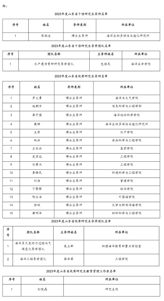近日,山东省教育厅下发了《关于表扬2023年度山东省十佳研究生导师等的通知》(鲁教研字〔2023〕13号),学校宋微波教授获评山东省十佳研究生导师,水产遗传育种研究导学团队获评山东省十佳研究生导学团队,罗义勇等15名导师获评山东省优秀研究生导师,海洋多尺度动力过程与气候变化导学团队、海洋工程导学团队获评山东省优秀研究生导学团队,孙晓晶获评山东省优秀研究生教育管理工作者。