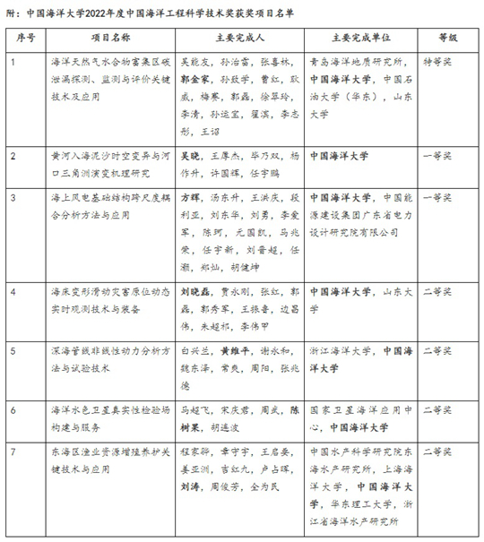 附:中国海洋大学2022年度中国海洋工程科学技术奖获奖项目名单